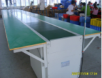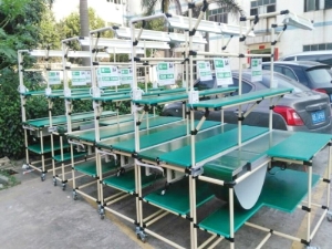O:工裝板尺寸 L450×W550×H25mm 結(jié)構(gòu)采用優(yōu)質(zhì)T25夾板制作,表面貼綠色防靜電膠皮,底面貼磨砂板,兩側(cè)邊開缺口;四周T型膠條包邊。 生產(chǎn)線工位單個(gè)板可以滿足53塊板(帶導(dǎo)電槽) 工裝板載重:20公斤。左上角安裝一位三孔插座1個(gè)