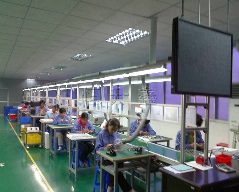 工作臺板:寬度自定,雙邊配置;采用T18mm木板,表面用萬能膠水粘貼T2.0mm綠色防靜電膠皮(加富牌),周邊T型膠條包邊,底部采用25×50長條扁通及三角架支撐固定。