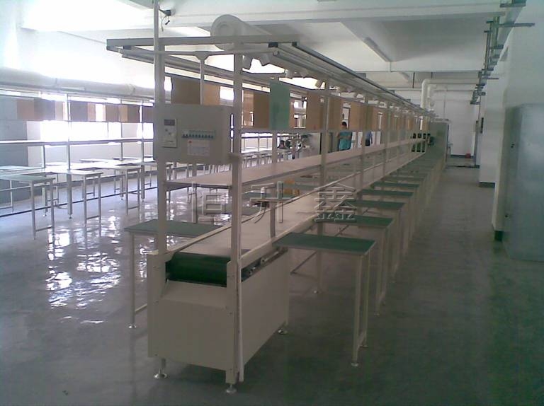 皮帶:寬度自定,綠色防靜電,采用無縫熱熔接駁;承托采用Φ25帶軸承鍍鋅滾筒,上層間隔250mm一條,下層間隔2m一條。