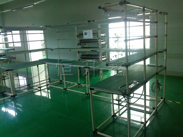 雙層旋轉(zhuǎn)工裝板:下層規(guī)格L600×W600×H25(mm);上層Φ600mm,臺板采用T25mm木板,表面防靜電膠皮,四周邊T型膠條包邊,每工位配置一塊。