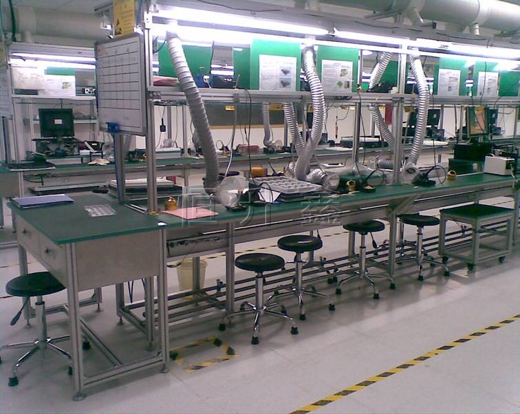 工作臺(tái)板:寬度自定,雙邊配置;采用T18mm木板,表面用萬(wàn)能膠水粘貼T2.0mm綠色防靜電膠皮(加富牌),周邊T型膠條包邊,底部采用25×50長(zhǎng)條扁通及三角架支撐固定。